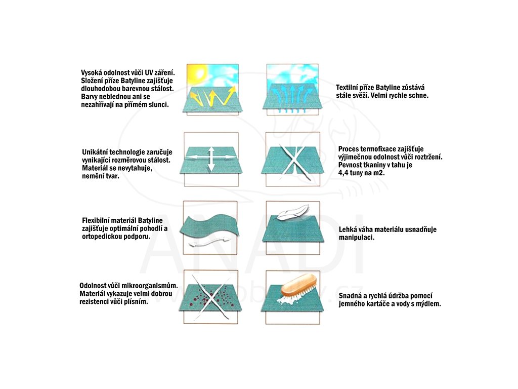 Original Batyline® - flexibilní kompozitní textílie pro vnitřní i venkovní použití. Výrobní proces termofixace zajišťuje výjimečnou odolnost proti roztržení, parametry tkaniny udávané výrobce v tahu jsou 4,4 t na m². Složení příze zajišťuje barevnou stálost i při dlouhodobém umístění na přímém slunci, v horkém počasí se materiál neohřívá.