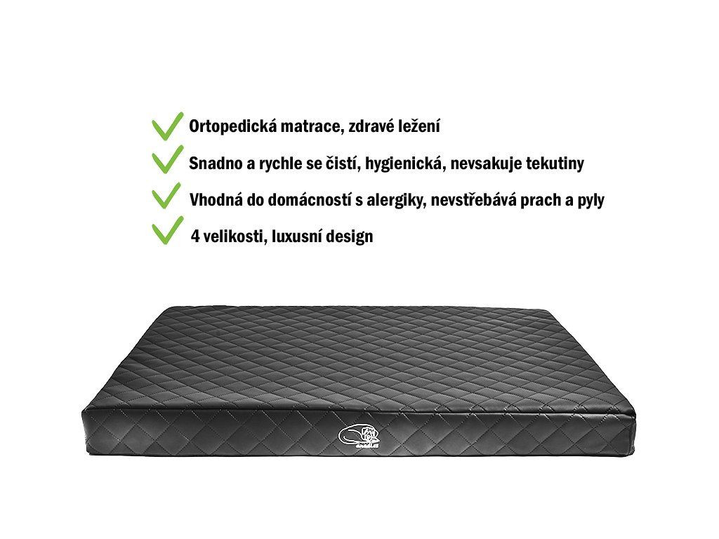 Základ matrace tvoří kvalitní pěna s velmi dobrou oporou těla a tvarovou stálostí. Horní vrstvu tvoří paměťová pěna přizpůsobivá tělu, rozkládá jeho hmotnost a vytváří protitlak. Nejedná se o žádnou drť, z identických materiálů se vyrábí ortopedické matrace pro lidi. Potah matrace je vyroben z umělé kůže, která patří k nejpraktičtějším pevným potahovým materiálům.